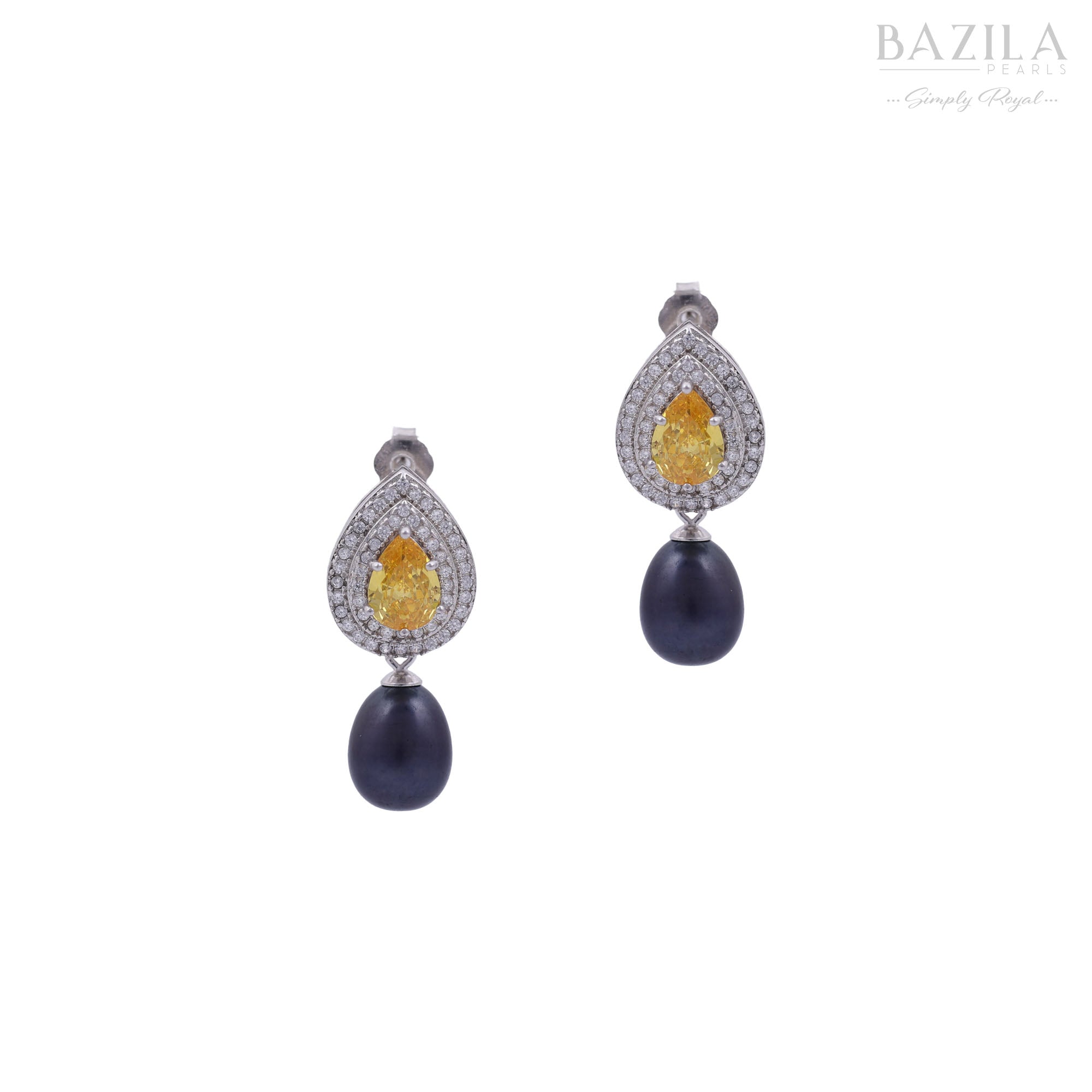 Black Fresh Pearl Teardrop Earrings with Yellow Stone – Silver Finish