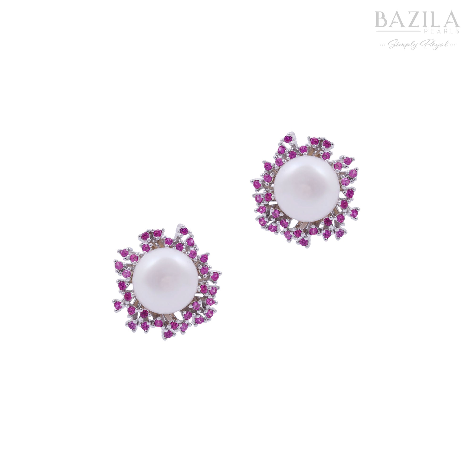 White Fresh Pearl Stud Earrings with Pink Stone Halo – Silver Finish