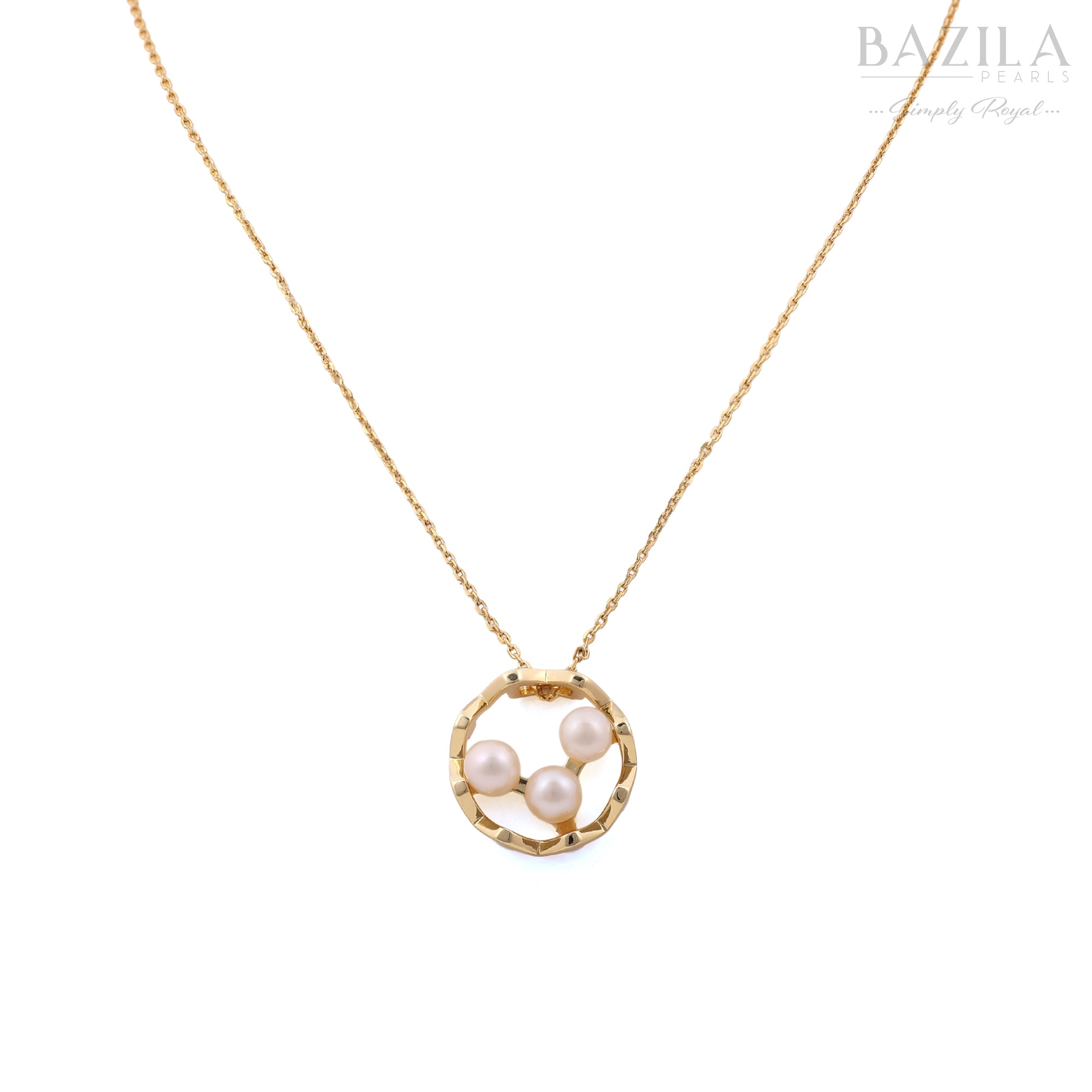 This elegant pendant features a contemporary open-circle design crafted in a polished gold finish. Inside the ring sit three Freshwater Cultured Pearls arranged in perfect harmony, creating a look that is both minimal and luxurious. The hammered-style detailing on the outer frame adds subtle texture and sophistication. Suspended from a delicate chain, this piece enhances everyday wear as beautifully as evening attire. A modern classic for those who love clean, refined jewellery.