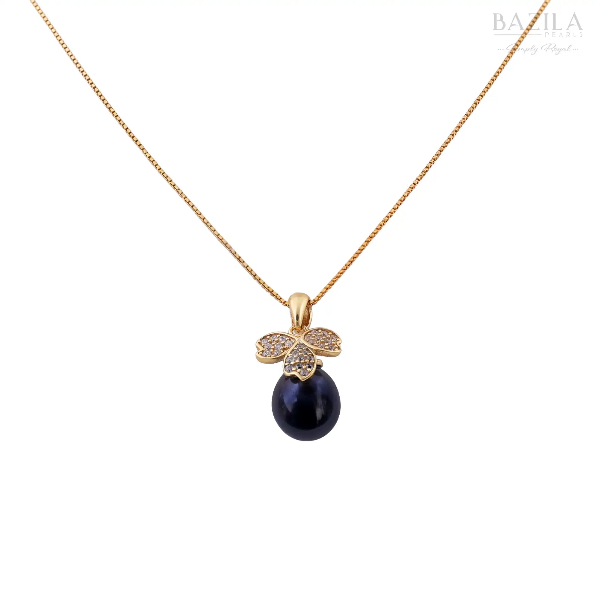 Black Pearl Clover Pendant Necklace in Gold Finish