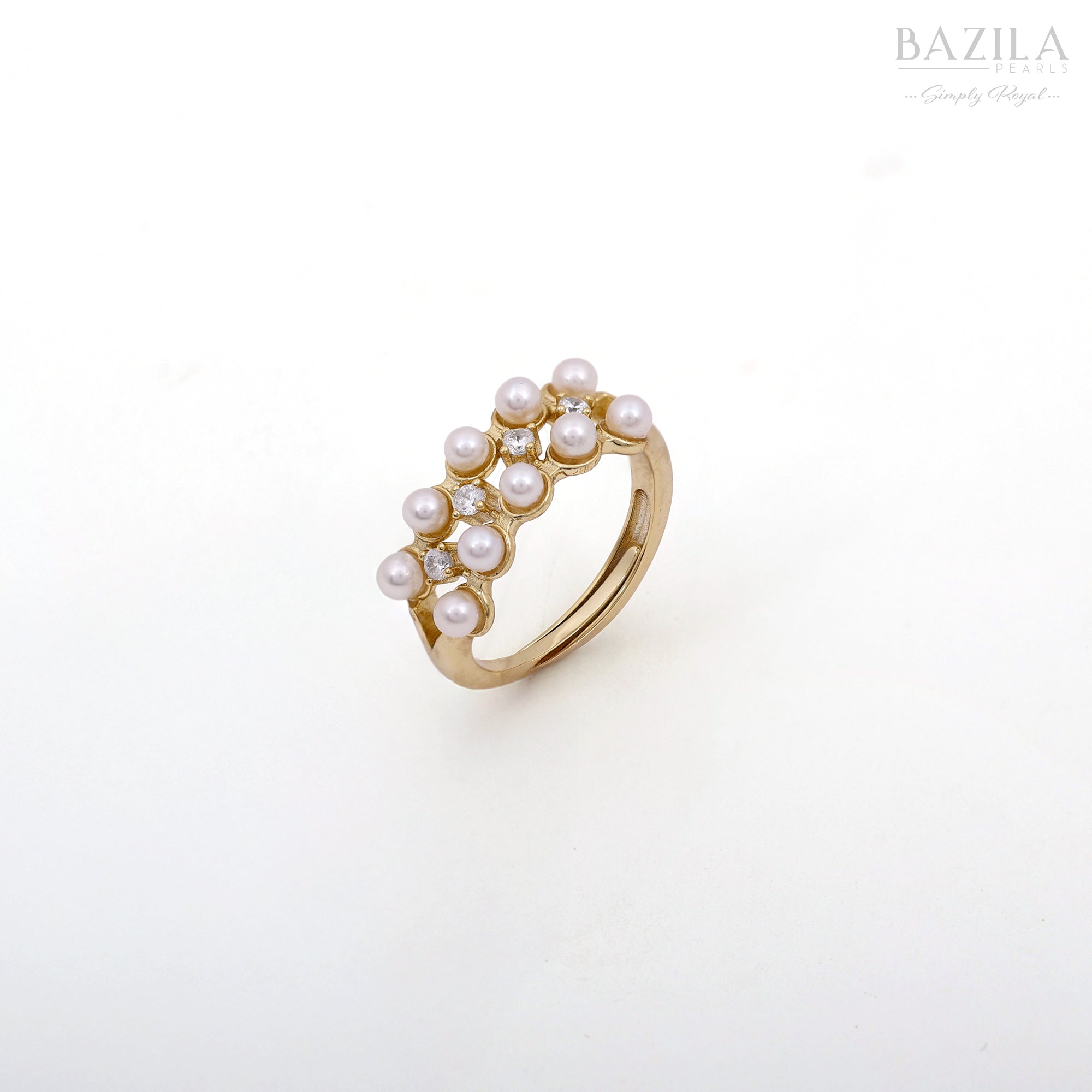 This beautifully crafted ring features a graceful arrangement of lustrous freshwater pearls paired with shimmering zircon stones for added brilliance. Set in a sleek gold-tone band, it brings a touch of sophistication and luxury to any look. Perfect for festive occasions, parties, and refined everyday style.