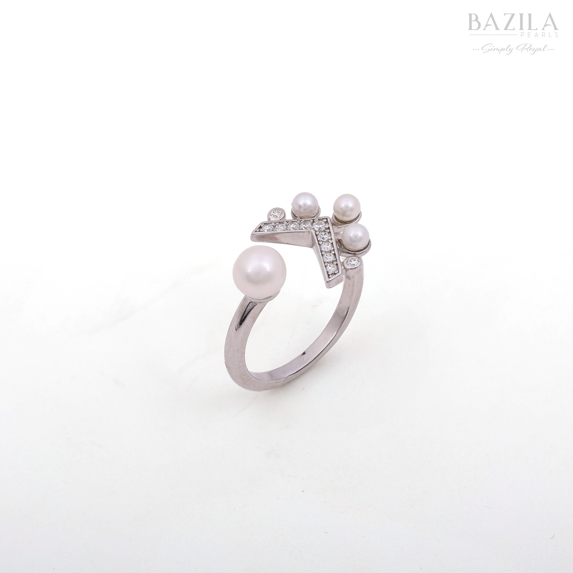 This contemporary ring features a stylish V-shaped zircon setting paired with lustrous freshwater pearls for a ch...