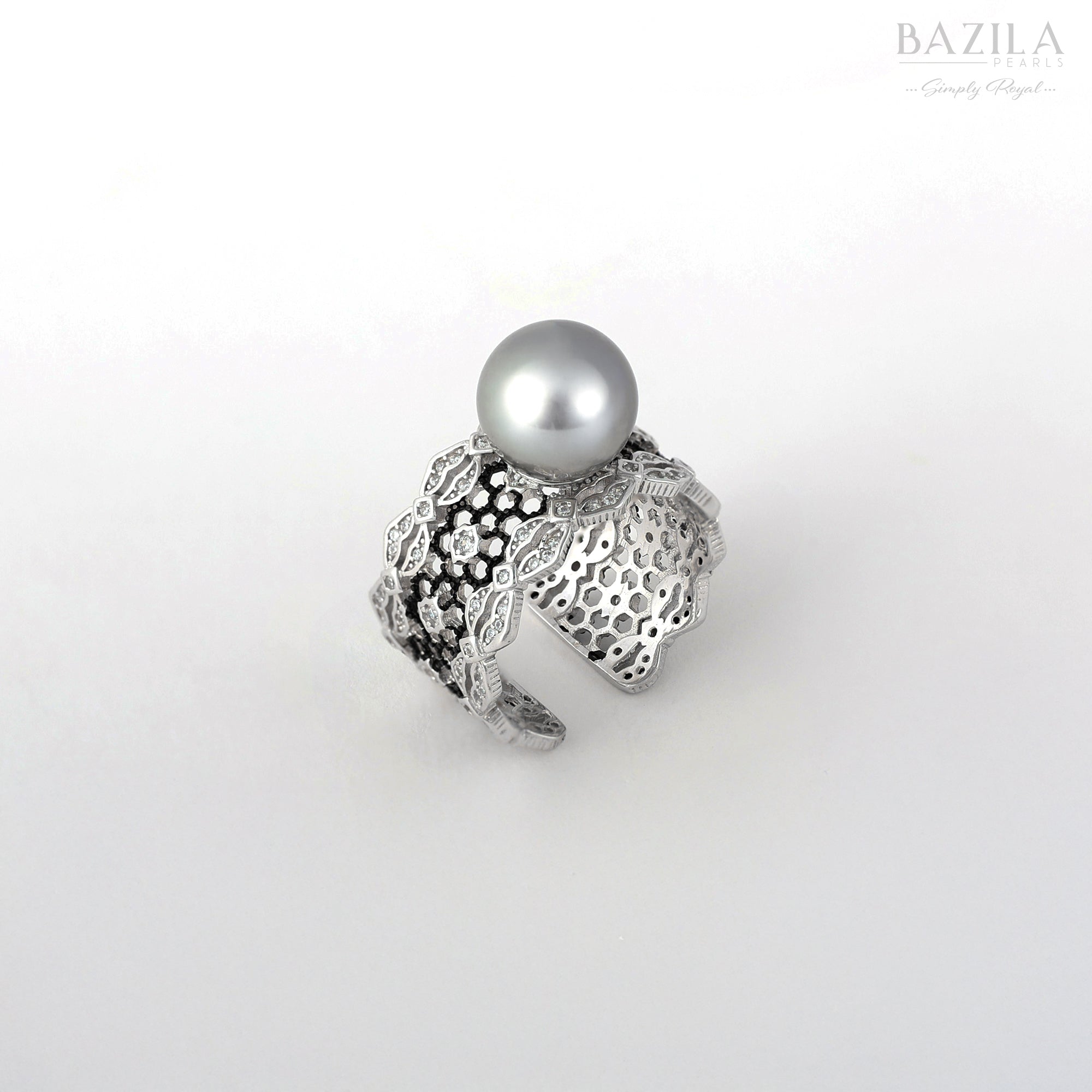 Seawater Cultured Akoya Pearl Silver Ring with Ornate Filigree Craftsmanship