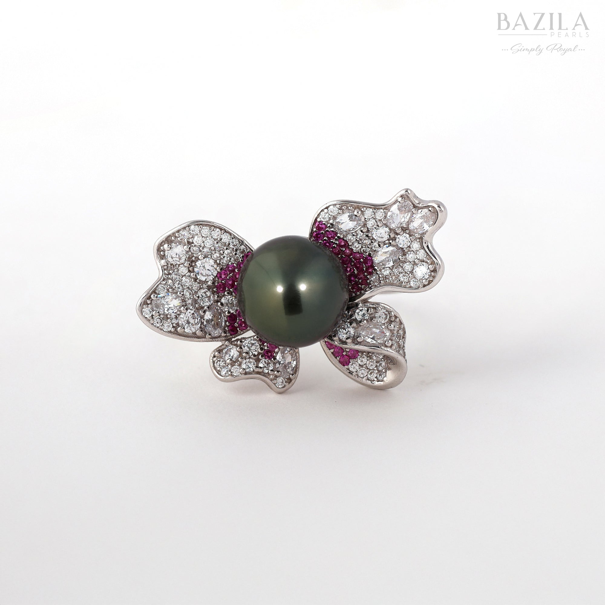 Tahitian Pearl Silver Ring with Zircon Sparkle and Ruby Accents in a Blooming Design