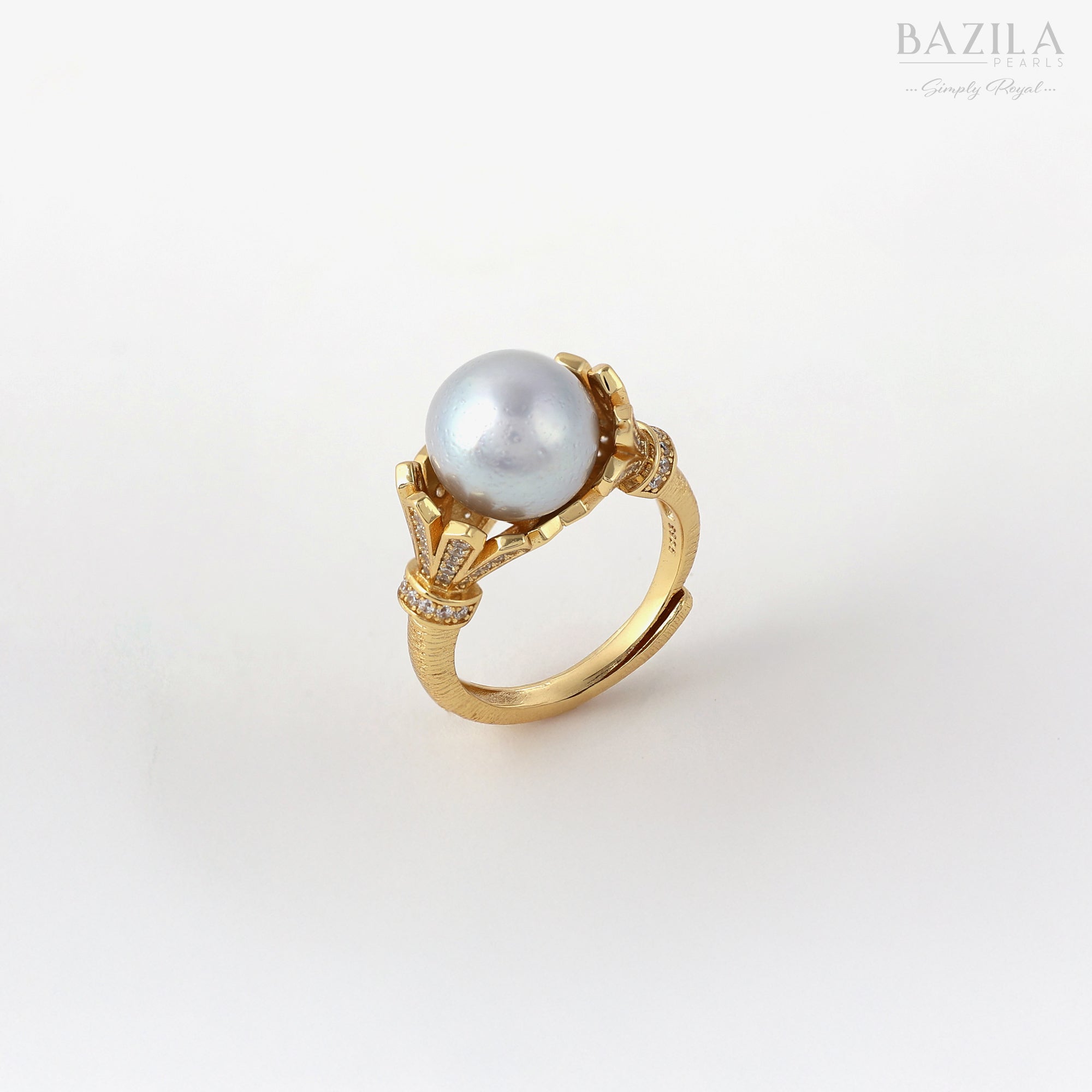 Classic South Sea Pearl Silver Ring with Gold-Tone Finish Embellishments